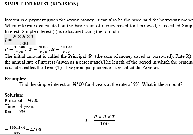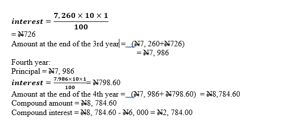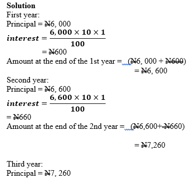 In compound interest, interest is calculated and added to the principal at the end of each interval, thus the principal increases and so the interest becomes larger for each interval. Most saving schemes give compound interest not simple. The total value at the end of the investment is the compound amount.