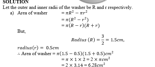 The figure below shows a circular metal washer. If the diameters of the washer and its hole are 3cm and 1cm respectively, find the area of the washer. Use the value 3.14 for .